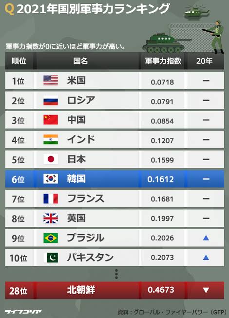 韓国が2021年世界軍事力ランキング6位、北朝鮮28位…日本は?