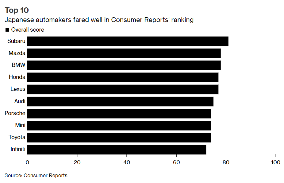 同誌はランク付けに当たって路上試験や信頼性、消費者満足度、安全性を考慮する。フィッシャー氏によると、番付はメーカーのラインアップにある各車種のスコア平均で決まる。