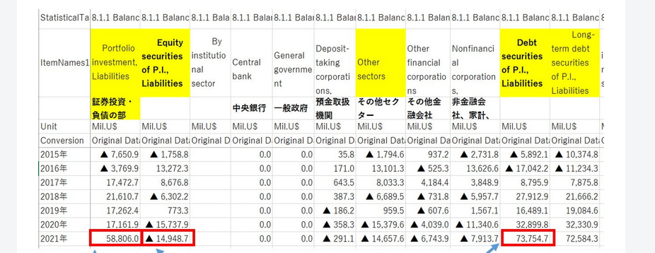 588億ドルは、海外が朝鮮の株や債券を買った数字なんだね(これらは返すお金で負債)