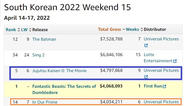 韓国の国内興行収入ランキング3位の『呪術廻戦0』に続き、こちらは8位にランク入りしている。