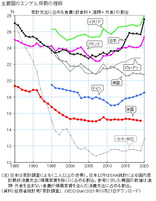 先進国では「美食国家」と言われるような、イタリア、フランス、日本なんかもエンゲル係数が途上国並みに高い。