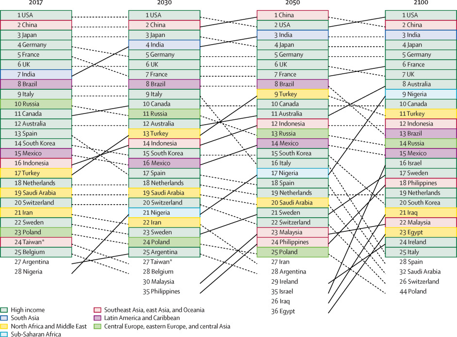 2017年の総GDPと2030年、2050年、2100年の参照シナリオによる上位25か国のランキング