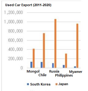 中古車販売の輸出台数は、日本が年間約120万台で、韓国が約30万台。