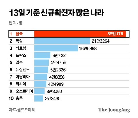 リアルタイム世界統計サイトのワールドオーメーターによると、グリニッジ標準時基準13日午後11時17分までの韓国の新規感染者は35万176人だった。この日の世界の新規感染者は132万3369人で、このうち26.5%が韓国から出た。前日の12日は韓国で38万3651人が新規感染した。世界の感染者142万9691人のうち26.8%だった。