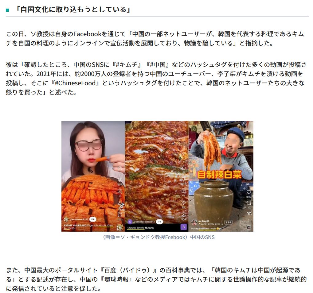 彼は「確認したところ、中国のSNSに『#キムチ』『#中国』などのハッシュタグを付けた多くの動画が投稿されていた。2021年には、約2000万人の登録者を持つ中国のユーチューバー、李子柒がキムチを漬ける動画を投稿し、そこに『#ChineseFood』というハッシュタグを付けたことで、韓国のネットユーザーたちの大きな怒りを買った」と述べた。