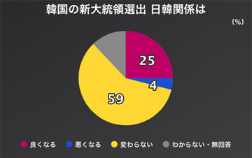 哀号‼NHK世論調査、新大統領選出で日韓関係「良くなる」25%「変わらない」59%