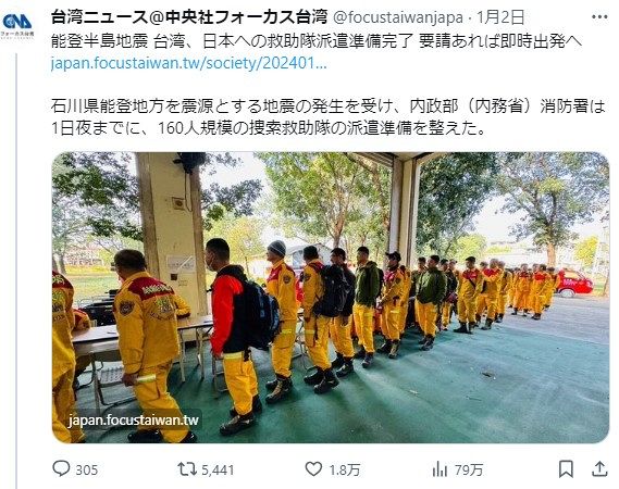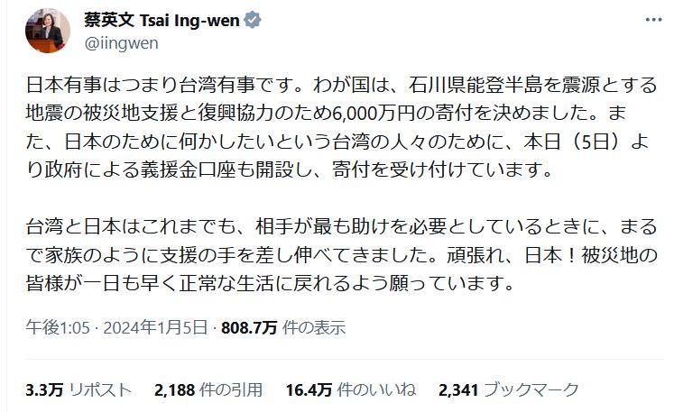 https://news.yahoo.co.jp/articles/6deff1ad2cb79375a034bdd7d8293ff080782a4c「台湾と日本は危機の時、手を差し伸べあう関係だ」能登半島地震受け台湾政府が6000万円の義援金