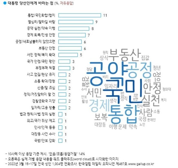 韓国国民が尹錫悦(ユン・ソクヨル)次期大統領に最も望んでいることは、統合と国民和合、協治だと示された。