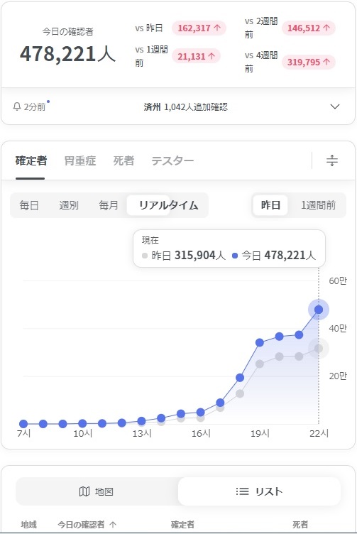 韓国では新型コロナの新規感染者が49万881人で過去二番目の数字を記録した。そして累計感染者は1000万人の大台を超えている。