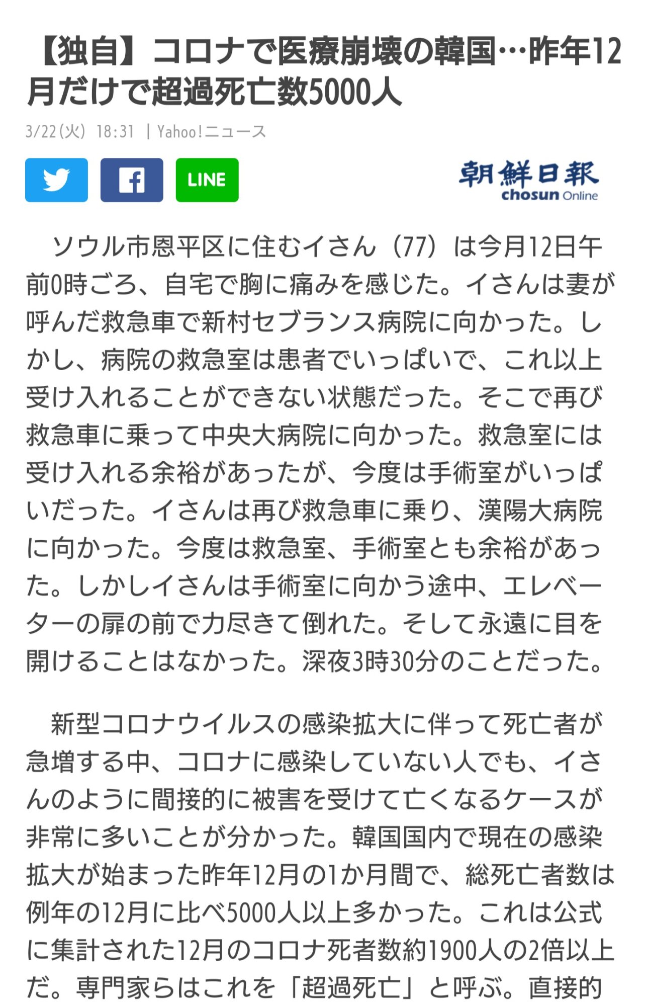 https://s.japanese.joins.com/JArticle/289091【独自】コロナで医療崩壊の韓国…昨年12月だけで超過死亡数5000人