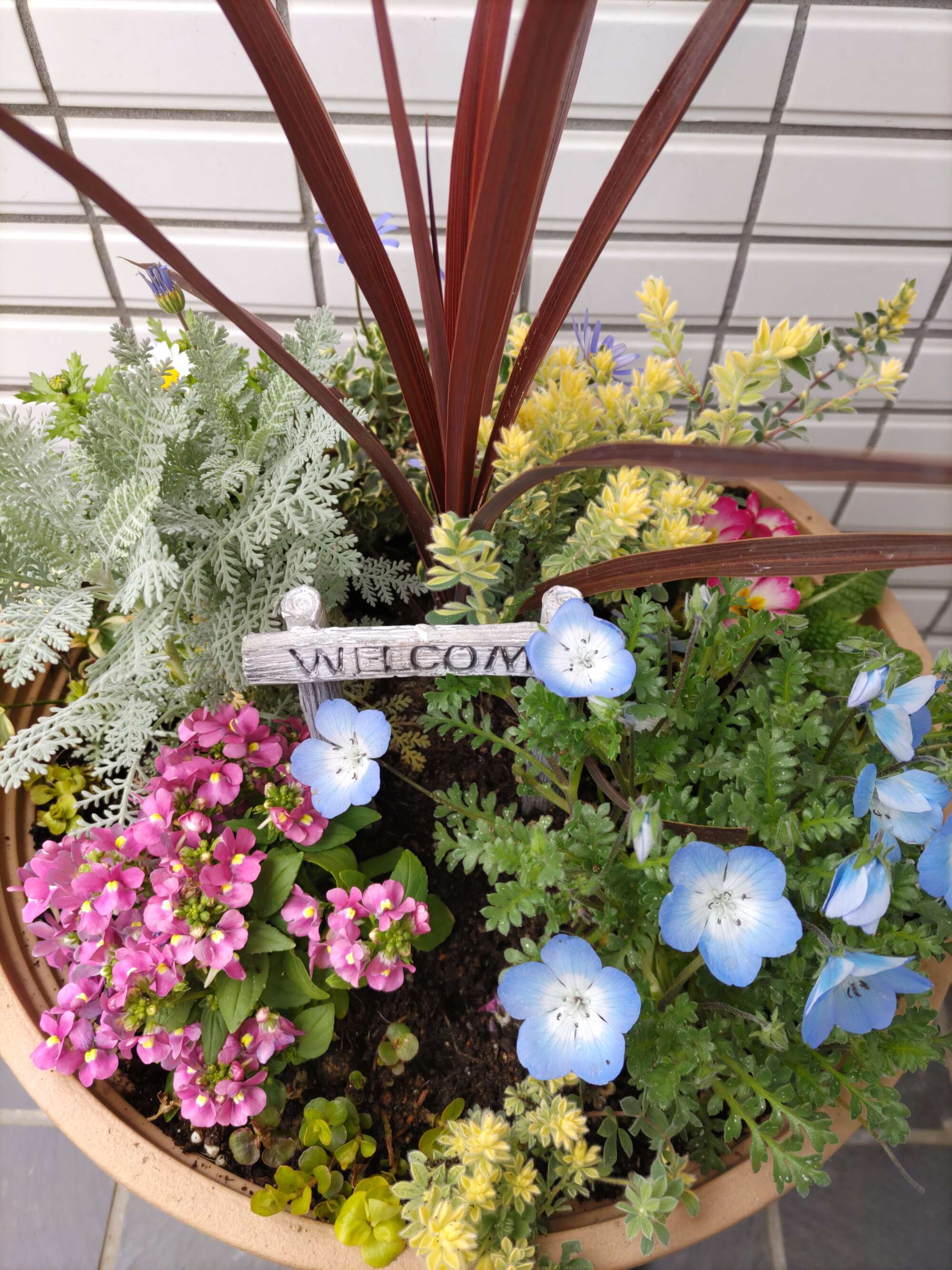 ガーデンシクラメンを庭の隅に移して、春の寄植えにしました