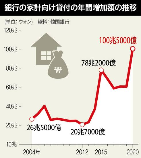 韓国の家計債務比率は2008年(138.5%)以来、12年間にわたり増え続けている。この期間に毎年3-4ポイント増加してきたが、10ポイント以上急激にアップしたのは2016年(12.2ポイント)と2020年だけだ。