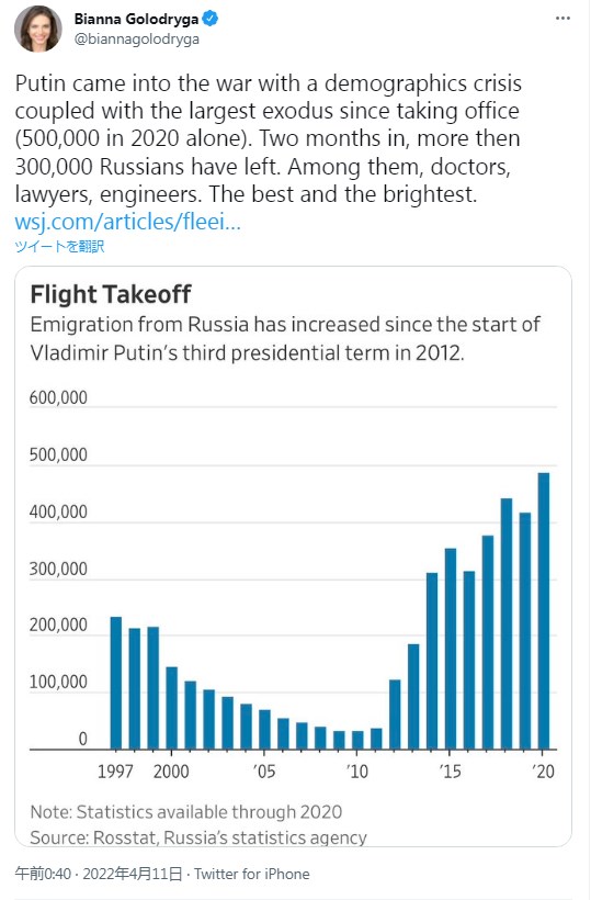【プーチンは、就任以来最大の脱出(2020年だけで50万人)と相まって、人口動態危機の戦争に入った。 2か月後、30万人以上のロシア人が去りました。 その中には、医師、弁護士、エンジニア。 未来は最も明るい。】