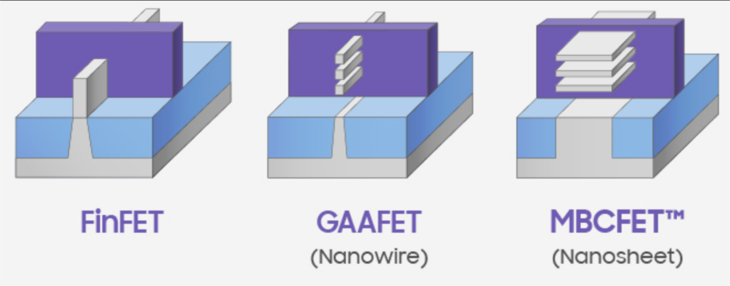 次期のプロセスでは狭くなったゲートの為にGAAって方式(中央)を各社が採用する