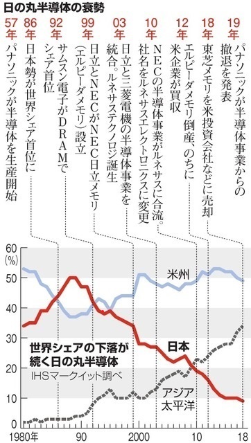 朝鮮人は日本の半導体産業が滅びた、と言いたいようだが、当時はアメリカの圧力で製造工程を他国に移しただけ。サムスン自体も日本の製造機器で、日本から製造技術を教えてもらって作ってただけ。基本的な特許や源泉技術は当時から今でもちゃんと持っている。製造機器も、日米蘭だけで世界シェアのほとんどを占める。今回の半導体不足のような事態解消のため、日本も再開するだけのこと。朝鮮教育は都合よく愚民を騙してるだけだ。いつになったら気付くのかね?気付いてるけど悔しいから認めたくないのかね?>>1