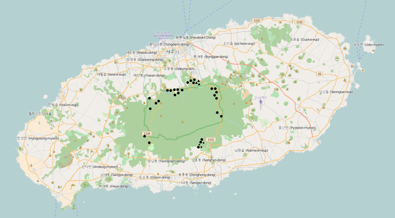 東西や南北では10kmくらいは離れているが漢拏山の麓でのみ見つかっている