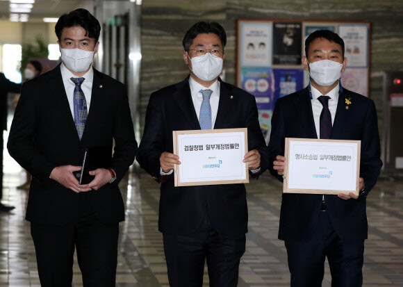 民主党は同日、パク・ホングン院内代表ほか171人の所属議員全員の発議で、検察庁法改正案と刑事訴訟法改正案をそれぞれ提出した。既存の検察庁法で定められている、検事が捜査できる犯罪の範囲から、腐敗、経済、公職者、選挙、防衛事業犯罪、大型惨事など大統領令で定める6大重要犯罪と、警察が送致した犯罪に関連して認知した直接関連性のある犯罪などを削除した。検察の捜査権条項を削除したということだ。