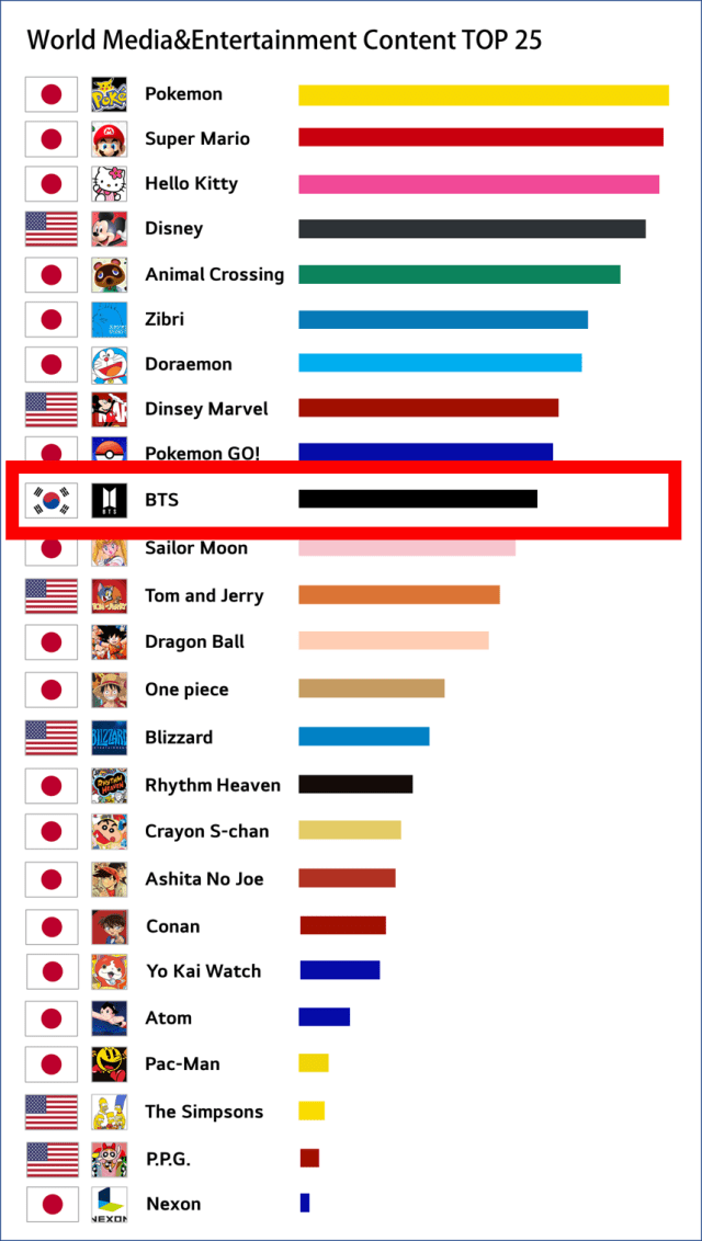 중앙일보가 동영상 공유 플랫폼 유튜브 음악 차트 통계를 활용해 최근 1년간(2021년 3월~2022년 2월) 주요 K팝 그룹의 팬덤을 분석한 결과다. BTS의 공식 뮤직비디오, 공식 음악을 이용한 사용자 제작 콘텐트(UCC), 가사 동영상 등은 이 기간 총 151억 회 재생됐는데, 이 중 20억 회 이상이 일본에서 발생하면서 BTS 소비국 1위를 기록했다. BTS의 본산인 한국은 7억6800만으로 6위에 올랐다. 전체의 5%에 불과하다.