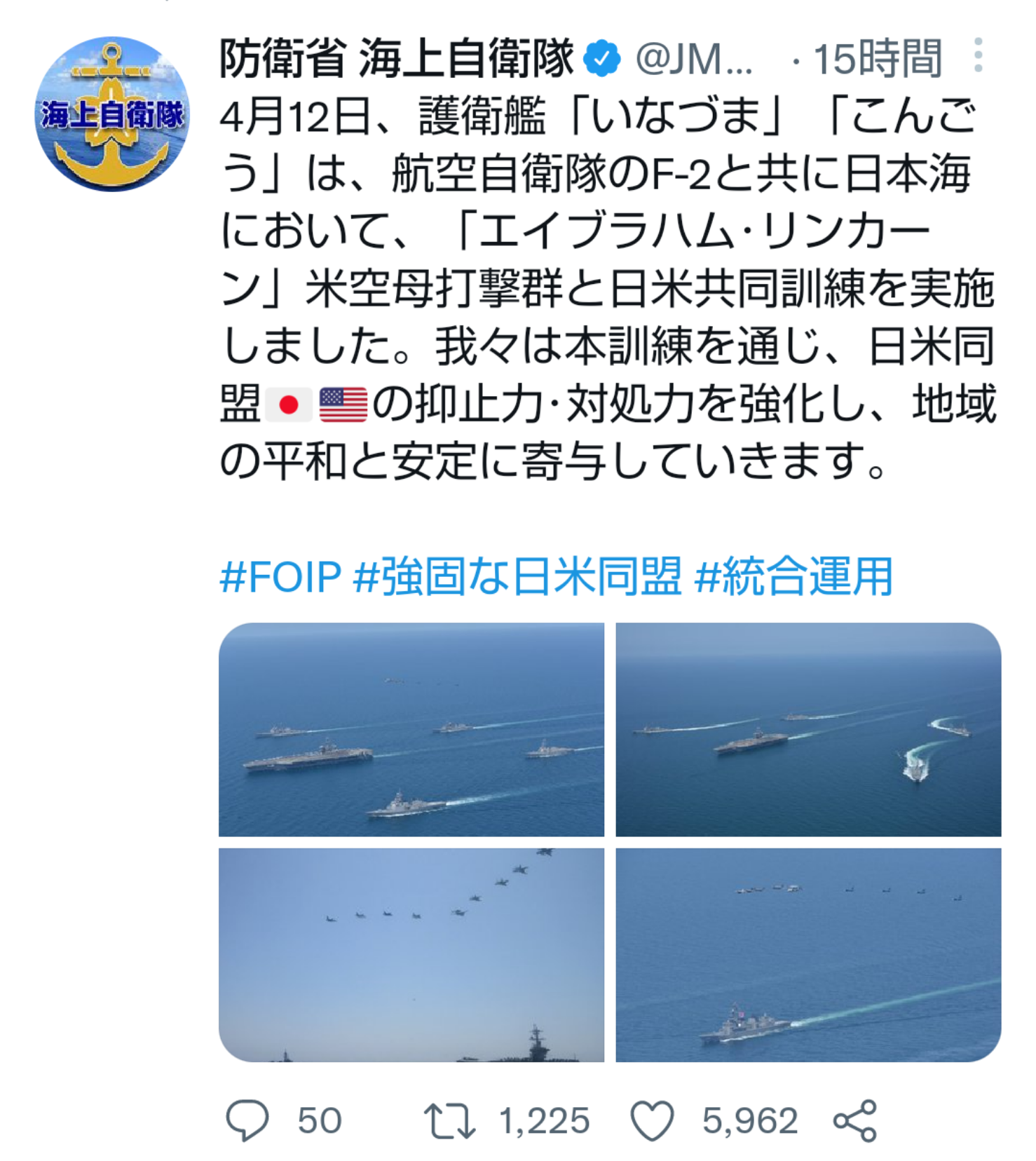 日米共同訓練を日本海上で実施また、韓国抜きか。