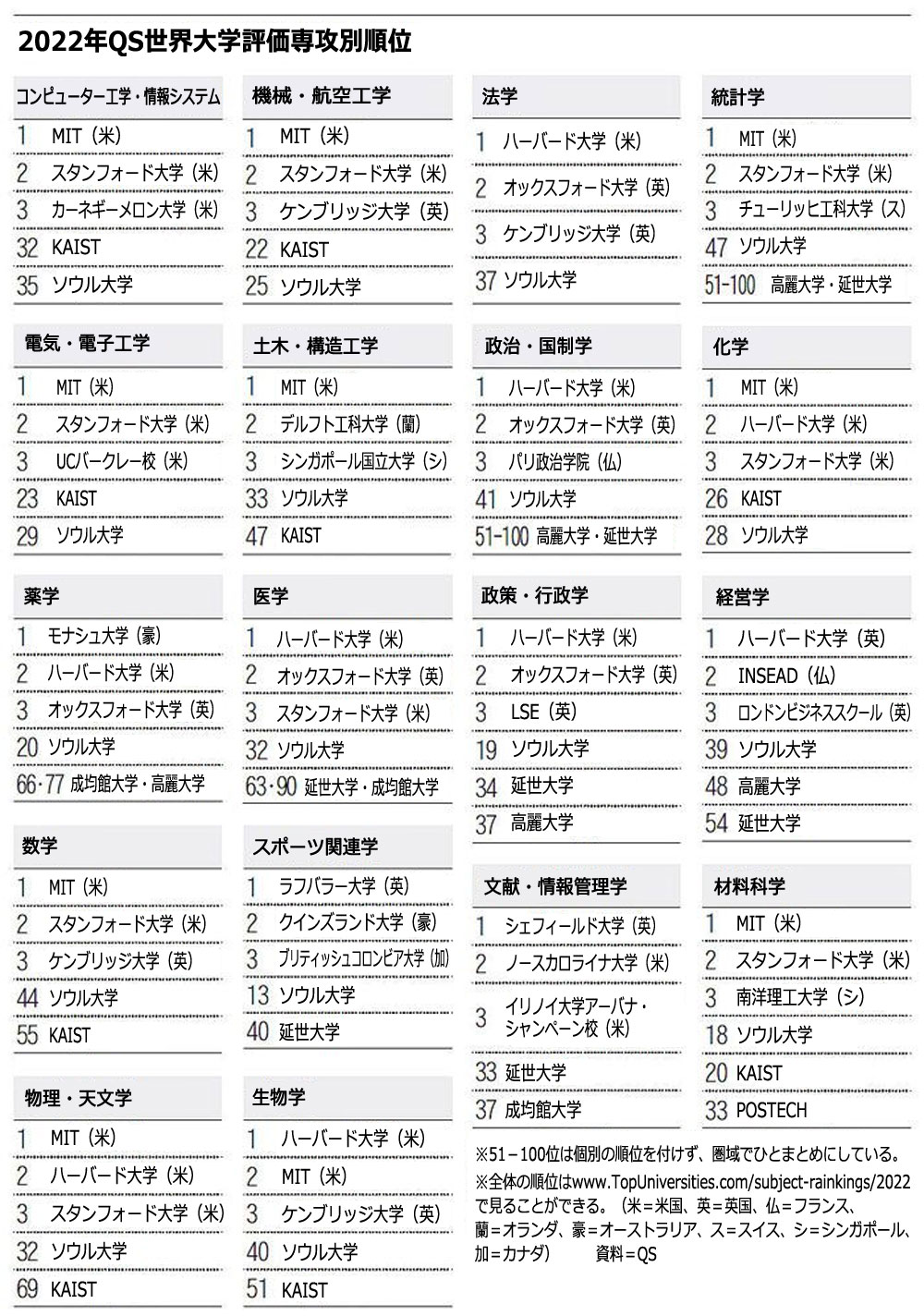 英国のグローバル大学評機関QS(クレクアレリ・シモンズ)が実施した「2022 QS世界大学評価専攻別順位」の結果が発表され、韓国の大学は4年連続でトップ10入り学科が1つもないことが判明した。