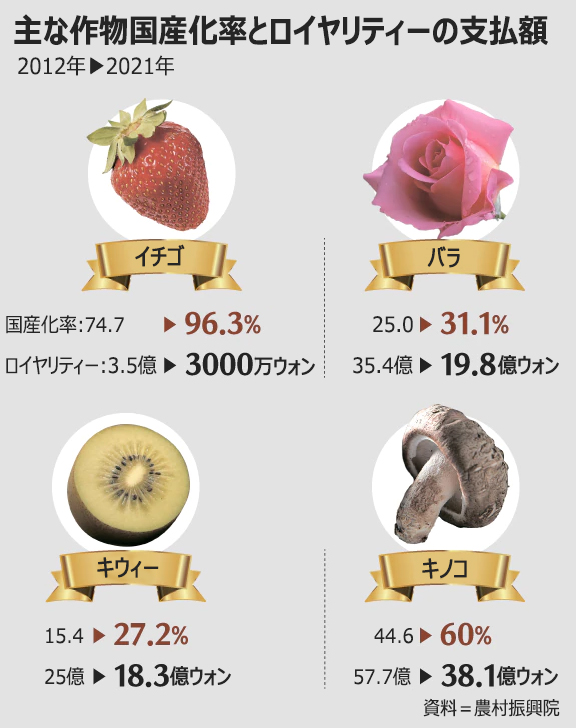 キノコよりも高い国産化率を誇る作物はイチゴだ。2005年に開発された「ソルヒャン」という品種は、当時80%を占めていた日本の品種を追いやった。「ソルヒャン」の急速な普及に伴いイチゴの国産化率は昨年96.3%まで上昇した。特に、イチゴは韓国産の品種が人気を集め、2012年に2244万ドル(約27億4000万円)だった輸出が、昨年は6348万ドル(約77億6000万円)にまで増えた。韓国産のイチゴが高級果物と認識された香港やシンガポールでは、コロナ以後に物流網が閉鎖されると、チャーター機まで利用して輸入するケースも見受けられた。韓国産イチゴの種「サンタ」は、1500万ウォン(約150万円)のロイヤルティーで中国に輸出することとなった。
