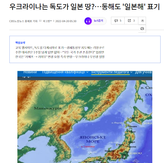 20日、ノーカットニュースによると、ウクライナ教育プラットフォームのウェブサイトであるvseosvita.uaは、学生の地理科目・日本編に収録された地図において「独島を竹島に、東海は日本海と表記した」ことが明らかになった。同紙は「それだけでなく、独島と鬱陵島の間に国境線を意味する点線まで引き、独島が日本領土であることをさらに明確にした」とし、同サイトが「独立的なメディアとして、私たちが掲示する資料は常に時宜を得た、客観的で検証されたもの」と自ら紹介していることを伝えた。