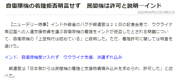 自民党の高市早苗政調会長は21日午前の党政調審議会で、ウクライナ避難民に支援物資を届けるため派遣を予定していた自衛隊の輸送機が、経由地のインドから受け入れを拒否されたと明らかにした。政府は国連平和維持活動(PKO)協力法に基づき、インドのムンバイにある国連難民高等弁務官事務所(UNHCR)の備蓄倉庫にある毛布などをポーランドやルーマニアに運ぶ方針だった。政府関係者は、調整不足が原因としている。