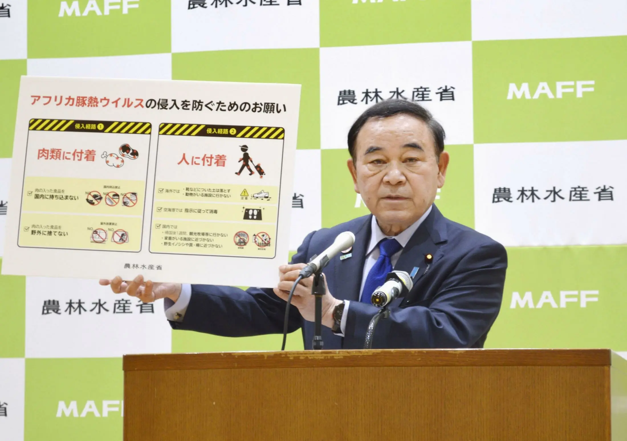 「(ASFは)一度侵入を許すと、わが国の畜産業に壊滅的な被害を生じることになる」。坂本哲志農林水産相は2日の閣議後記者会見で危機感を強調し、訪日客や帰国する日本人の靴の消毒の強化など水際対策を徹底する方針を示した。