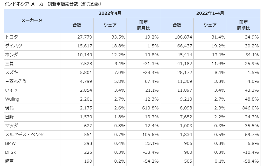 🤣😂⤵インドネシア メーカー別自動車販売台数 2022年4月 1月~4月