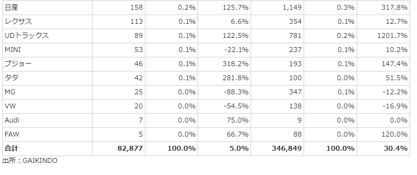 そのメーカーシェアはトヨタがトップで上位7社は日本車でその次は中国車