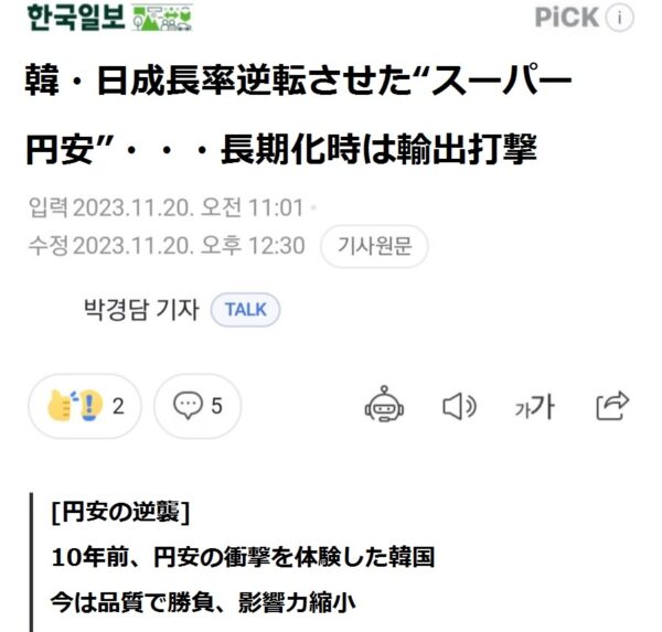 これにより、韓国の成長率は、25年以上前のアジア通貨危機以降、初めて日本に逆転される見通しとなっています。