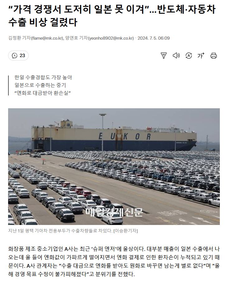 エンジャーによる輸出負担が特に大きいものとみられる。半導体・自動車をはじめとする主力業種は韓国が相当な技術力を保有したが、他の産業は世界市場で日本と競争する程度が強いからだ。それだけ価格競争力が重要な要因という意味だ。
