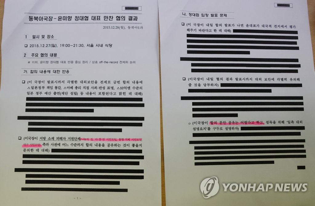 「東北アジア局長と挺対協代表の面談結果(日本軍慰安婦問題)」と題した文書には、「外交部の東北アジア局長が15年3月9日に挺対協の要請で尹氏と会い、慰安婦問題に関する韓日の協議動向や死去した慰安婦被害者に対する補償問題、被害者の意見のとりまとめなどについて意見を交わした」と記録されている。