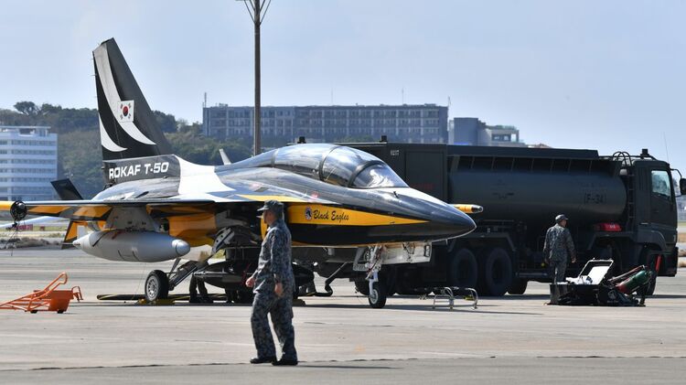 한국에 강력히 항의했다고 밝혔다.공군 블랙이글스가 중동 방산전시회 참가차 오는 28일, 일본 오키나와에 기항할 때 항공자위대 특수비행팀이 직접 T-50 훈련기를 살펴볼 것으로 알려졌습니다.