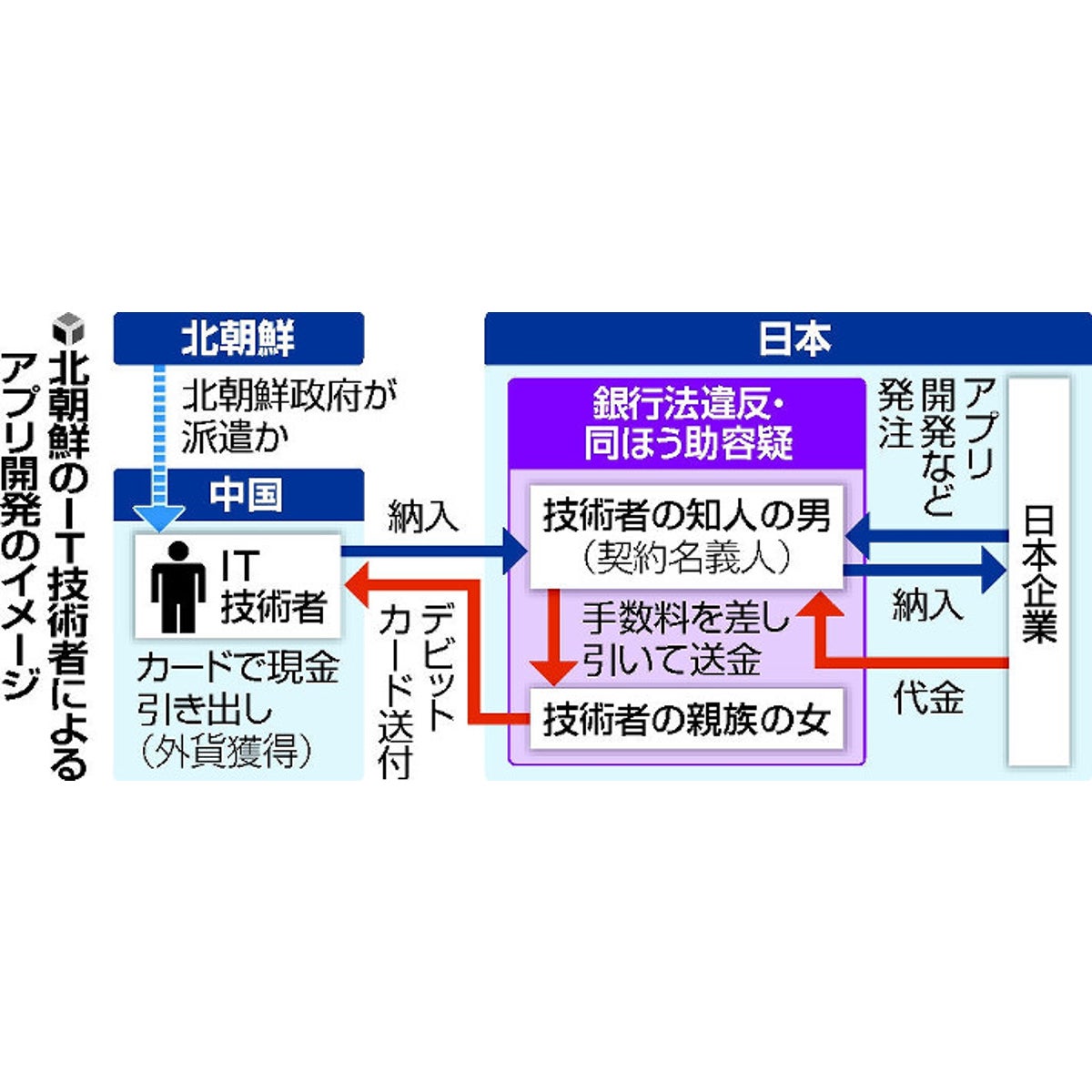 中国に住む北朝鮮のIT技術者が、日本に住む知人の名義を使って、日本のスマートフォンアプリの開発業務を請け負っていたことが捜査関係者への取材でわかった。報酬は知人の口座から日本に住む親族の口座に送金させ、中国で現金を引き出していた。