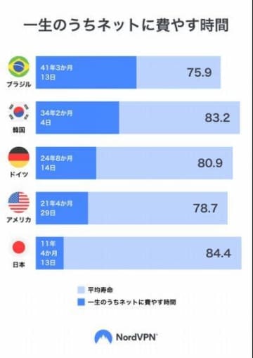 調査対象国16カ国で、一生のうちネットに費やす時間が最も多かったのは、ブラジルで41年3カ月13日だった。これに、韓国、ドイツ、アメリカ、日本が続いている。