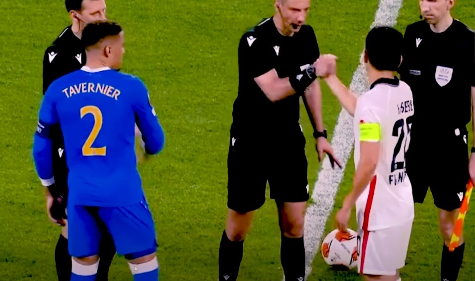 開始5分でレンジャーズの選手が、フランクフルトのローデ選手への顔面への蹴りを入れた