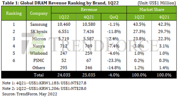 삼성전자 DRAM '부동의 1위' 1분기 점유율 확대