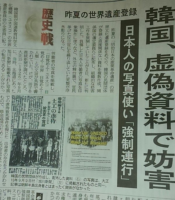 あれ見るとウォルトディズニーとミッキーマウスの像を思い出して、しばし一人笑いしちゃうんだよね。朝鮮人を奴隷として使ってたわけじゃなく、日本人も頑張ってやせ細ってまで働いてた証拠の写真をモデルにするとか墓穴すぎる