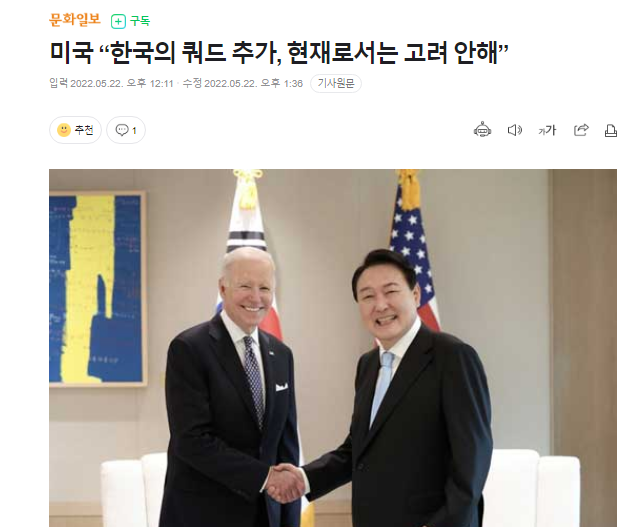 米高官は同日、バイデン大統領の韓日歴訪に同行した記者団とのブリーフィングで、「韓国のクアッド追加は現在のところ考慮していない」とし、「新加盟国を考えるよりは、クアッドがすでに提示したものを発展·強化することが今の目標だ」と述べた。 彼は「クアッドは相対的に新しい機構であり最善の協力方案を依然として探す新しい機構ということに注目する必要がある」として「新規会員国加入問題は見守る部分」と説明した。 (省略)
