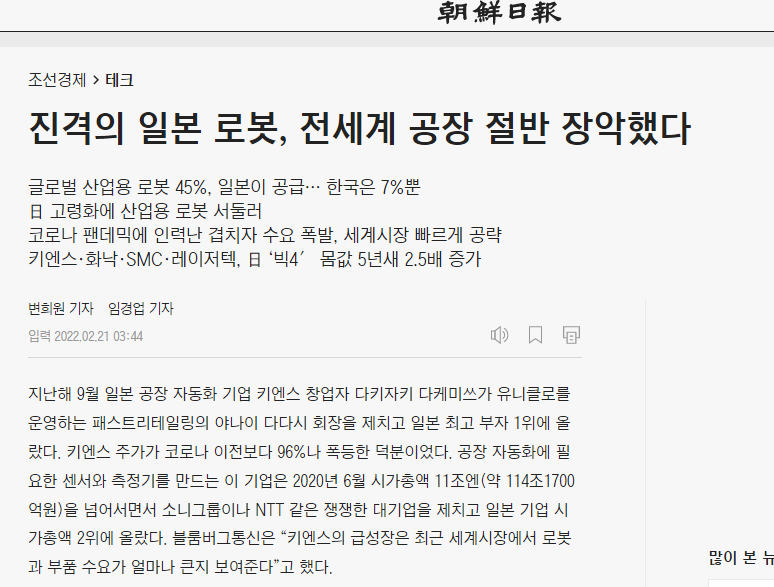朝鮮日報は21日、『進撃の日本ロボット、全世界工場の半分を掌握した』というタイトル記事を掲載し、キーエンスやファナック、SMCやレーザーテックなど日本のロボット企業の躍進を伝えている。