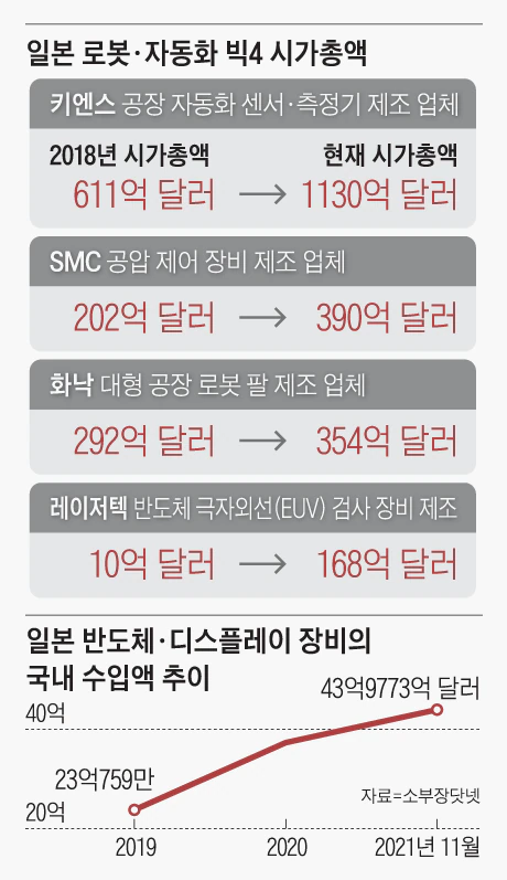 朝鮮日報は韓国の産業用ロボット密度(職員1万人当たりのロボット使用台数)が932台と「世界で産業自動化比率が最も高い国に挙げられる」としつつ、「しかし、需要に比べて国内技術力と生産能力が不足し、産業自動化が進むほど日本への依存度は高まるしかない構造だ」と述べている。