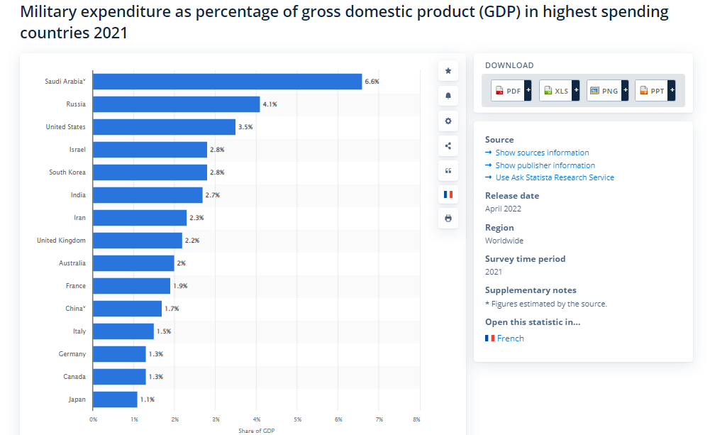 日本では1976年に三木武夫内閣が軍事大国化を防ぐために防衛費をGDP比1%以内で維持する案を閣議で決めた。1987年に当時の中曽根康弘首相が公式にこれを撤廃したが、歴代政権はGDP比1%を防衛費の暗黙的な基準としてきた。