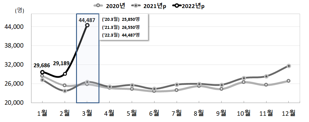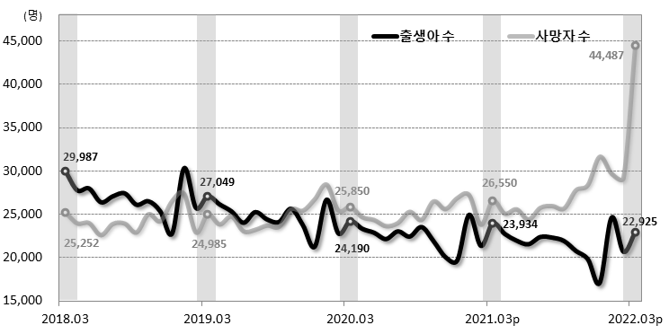 統計庁の関係者は「3月にオミクロン株感染者数も1000万人を超え、死亡者数も8000人を超えたため、新型コロナの影響を多く受けたものと予想している。しかし、新型コロナの余波がこのような現象をどこまで説明できるかは正確に判断できない」と述べた。2月にも全国の死亡者数が前年に比べて22.7%増え、異例の増加率を示した。