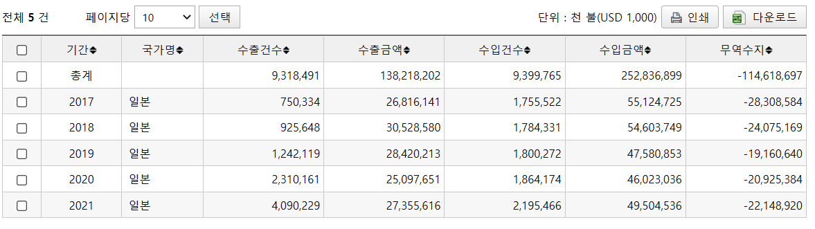 対日異存は無くしたと言った元大統領はどこに隠れているのか?今年の累積貿易赤字は78億5000万ドルと集計された。 1~5月基準の貿易赤字がこんな規模まで膨れ上がったのは、1997年(※IMF入りのとき)当時92億6000万ドルの赤字を記録してから、25年ぶりだ。 グローバル経済危機(※リーマンショックなど)と言われた2008年(63億4000万ドル)と比較しても、15億1000万ドル多い。 この傾向が続くなら、1~2カ月以内に貿易赤字が100億ドルを超えることがもありえる
