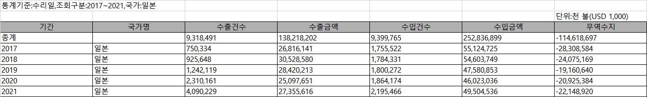 下記の表でわかるように2021年の年間累計では韓国の日本に対する貿易赤字は約221.5億ドルでした