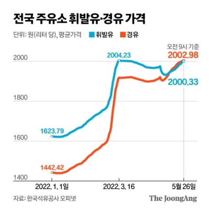 国内で売る軽油とガソリン平均価格が史上初めてともにL当たり2000ウォンを超えた。国際原油価格の激しい上昇に政府の油流税引き下げ幅拡大政策も大きな効果を発揮できずにいる。 26日、韓国石油公社油価情報サイトオフィネットはこの日午前9時基準で全国ガソリンスタンドガソリン平均販売価格が前日よりL当たり1.74ウォン上がった2000.33ウォンだと明らかにした。軽油平均販売価格も同時間L当たり2002.98ウォンを記録し、ガソリンと軽油とも2000ウォン台を超えた。- 123