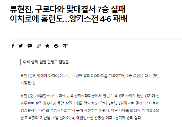 リュ・ヒョンジン=2勝、防御率5.67