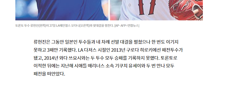 リュ・ヒョンジンはこれまで日本人投手と4回先発対決を繰り広げたが、一度も勝てず3敗だけを記録した。 LAドジャース時代の2013年黒田博樹では敗戦投手になり、2014年和田毅とは両投手とも勝敗を記録できなかった。 トロントに移籍した後は、昨年シアトル·マリナーズ所属の菊池雄星と2度戦って、いずれも敗戦を抱えた。