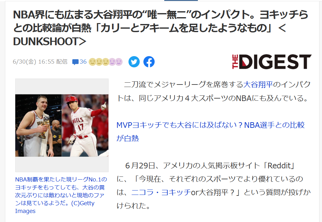 6月29日、アメリカの人気掲示板サイト「Reddit」に、「今現在、それぞれのスポーツでより優れているのは、ニコラ・ヨキッチor大谷翔平?」という質問が投げかけられた。